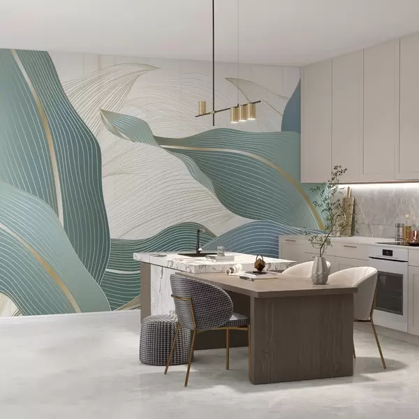 Τοιχογραφίες Αφηρημένο μοτίβο με μεγάλα κυματιστά φύλλα σε αποχρώσεις του μπλε και του μπεζ σε ανοιχτό φόντο με λεπτές υφές Nr. w08686