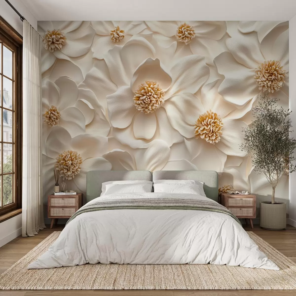 Τοιχογραφίες 3D μπεζ σύνθεση λουλουδιών με κίτρινες πινελιές Nr. w08691