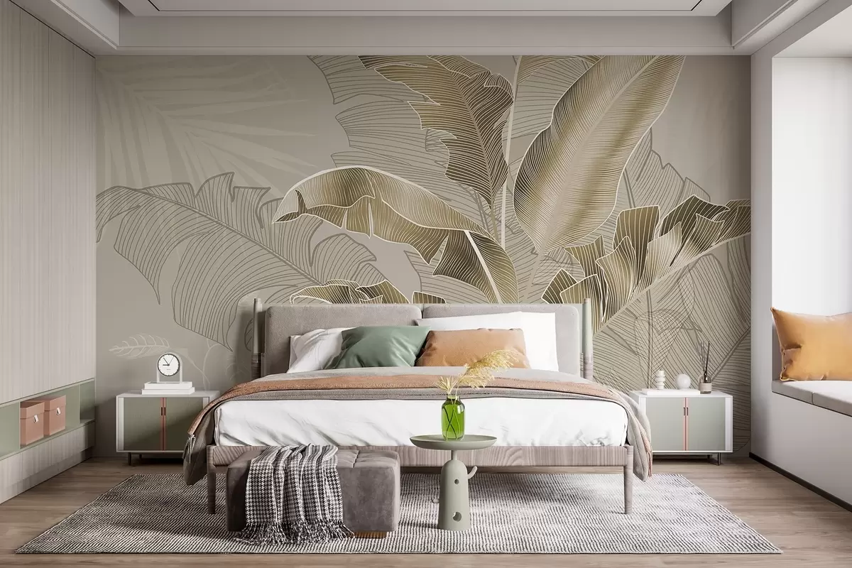 Τοιχογραφίες Μια αρμονική σύνθεση τροπικών φύλλων σε αποχρώσεις του μπεζ και του καφέ, με λεπτομερή γραμμογράφηση Nr. w08698