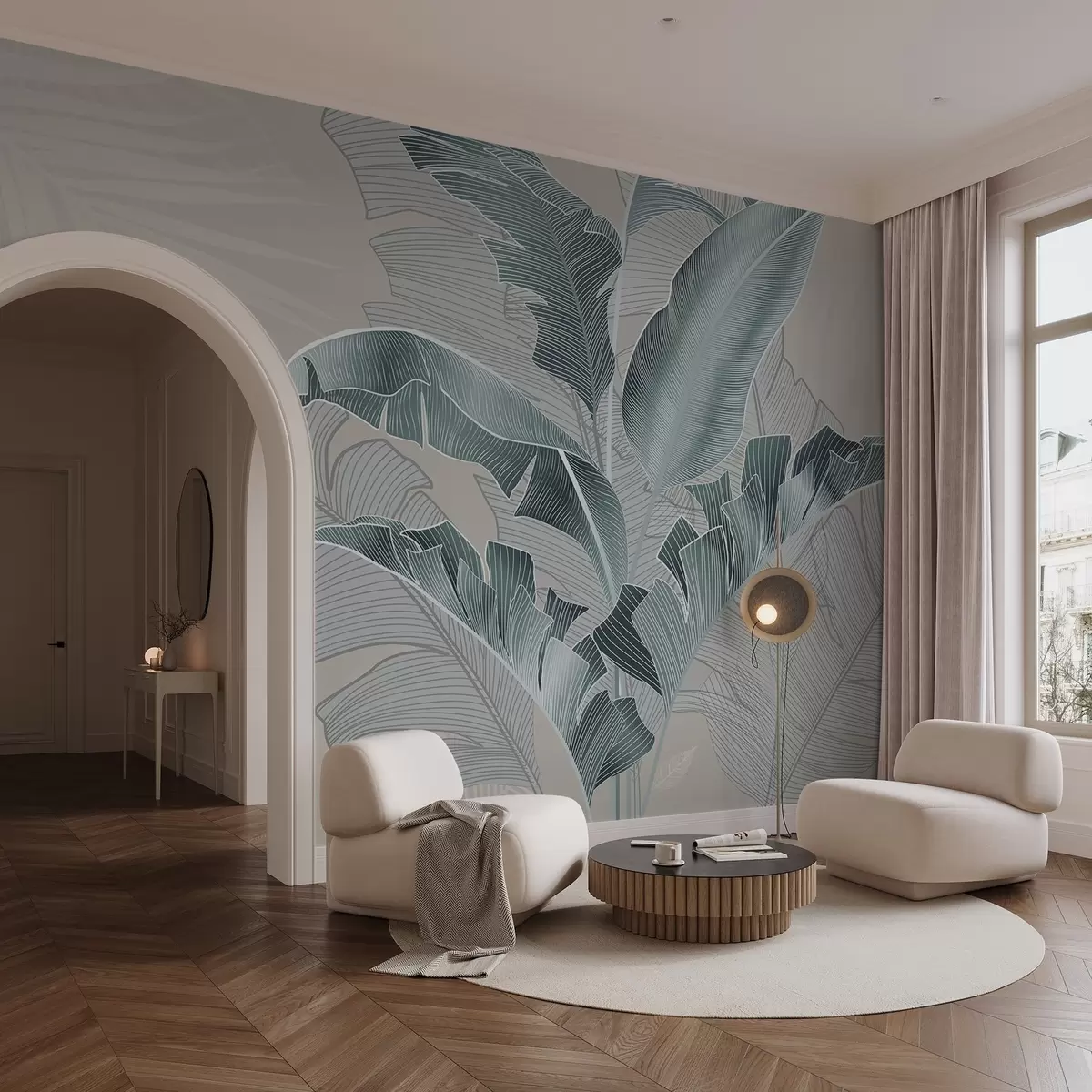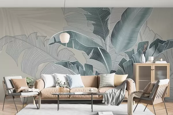 Τοιχογραφίες Μια αρμονική σύνθεση τροπικών φύλλων σε αποχρώσεις του μπεζ και του τιρκουάζ, με λεπτομερή γραμμοσκίαση Nr. w08698v1