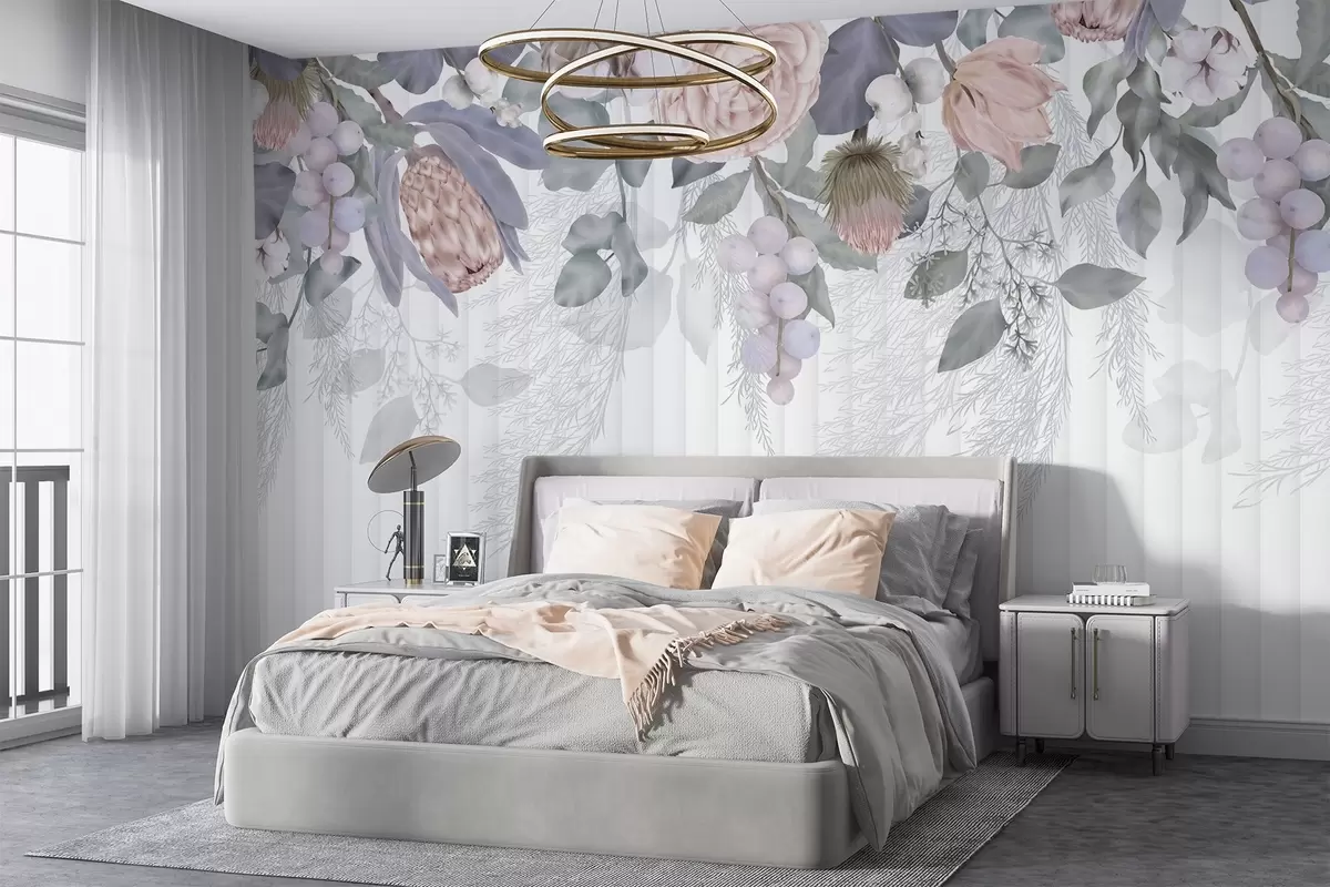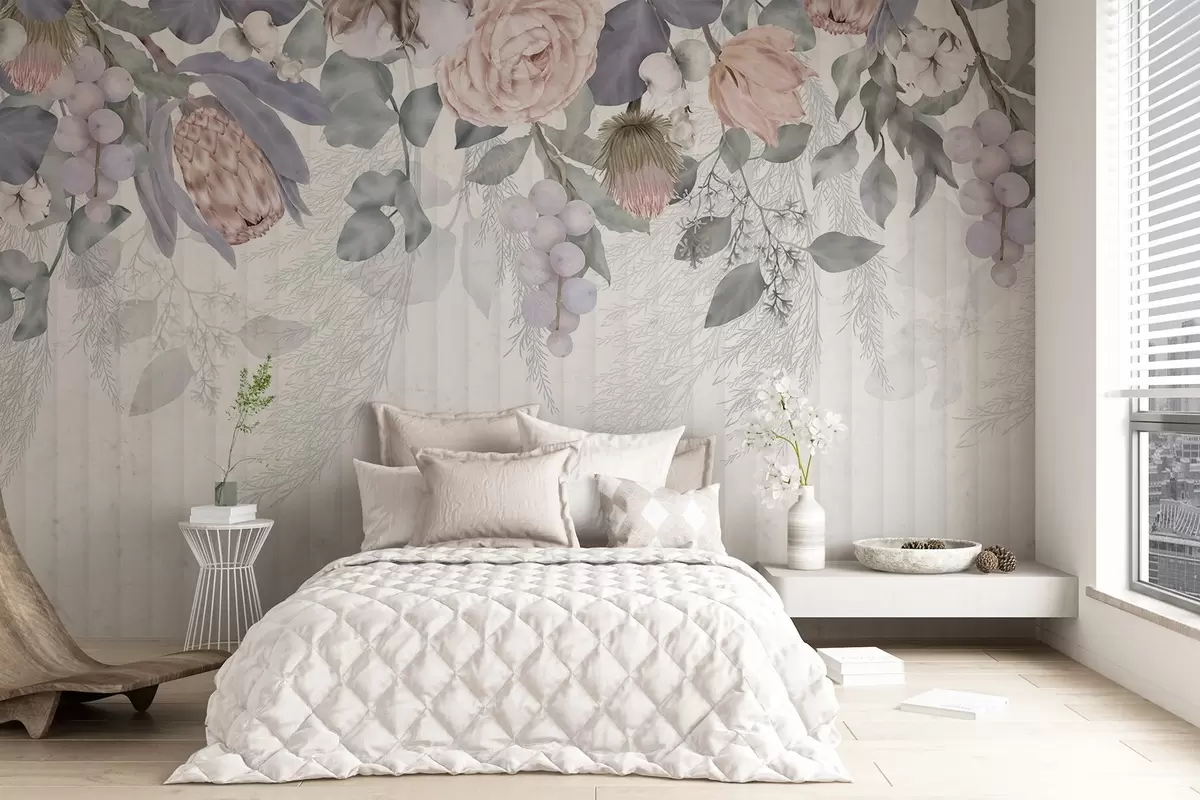 Τοιχογραφίες Ένα λουλουδάτο παστέλ-χρώμα ροζ τριαντάφυλλα, άνθη πρωτεΐνης, κλαδιά ευκαλύπτου και μούρα σε φόντο με υφή Nr. w08700