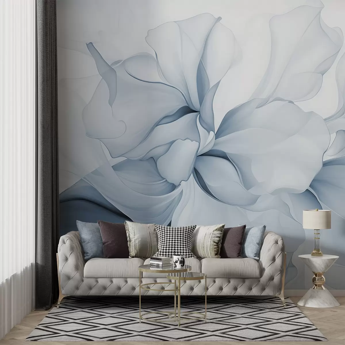Τοιχογραφίες Ρευστά αφηρημένα πέταλα λουλουδιών ημιδιαφανή και πολυεπίπεδα σχήματα σε παστέλ χρώματα, σε μπλε αποχρώσεις Nr. w08701v2