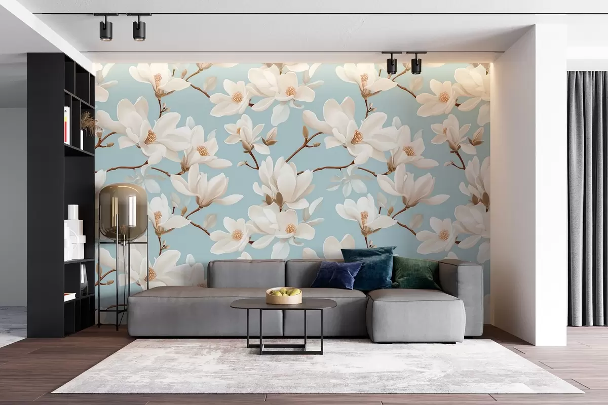 Τοιχογραφίες Μοτίβο από λευκά λουλούδια μανόλιας, παστέλ μπλε φόντο, λευκά φύλλα και κλαδιά Nr. w08726