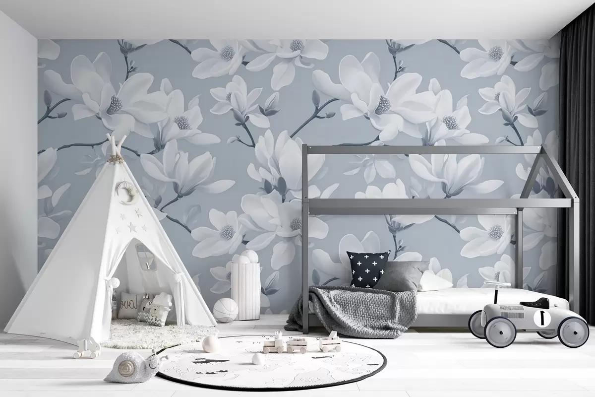 Τοιχογραφίες Μοτίβο από λευκά άνθη μανόλιας, σε γαλάζιες αποχρώσεις, λευκά φύλλα και κλαδιά Nr. w08726v2