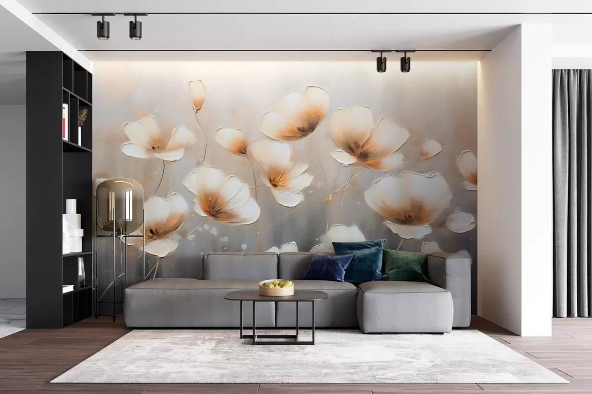 Τοιχογραφίες Κομψά λουλούδια με λεπτά, απαλά πέταλα σε μπεζ-μπλε αποχρώσεις Nr. w08746v1