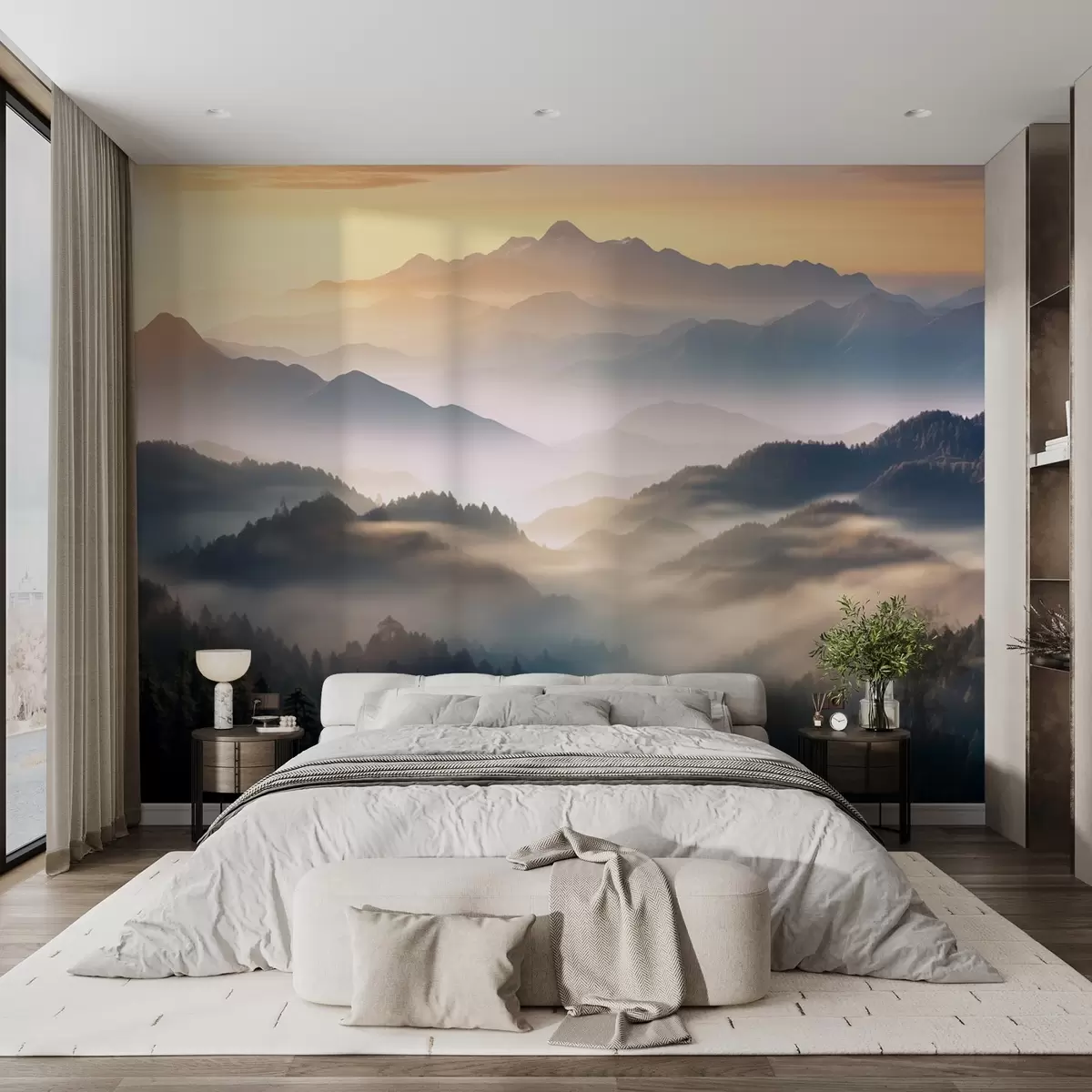 Τοιχογραφίες Γαλήνιο ορεινό τοπίο την αυγή, με απαλή ομίχλη να τυλίγει τα πεύκα Nr. w08748