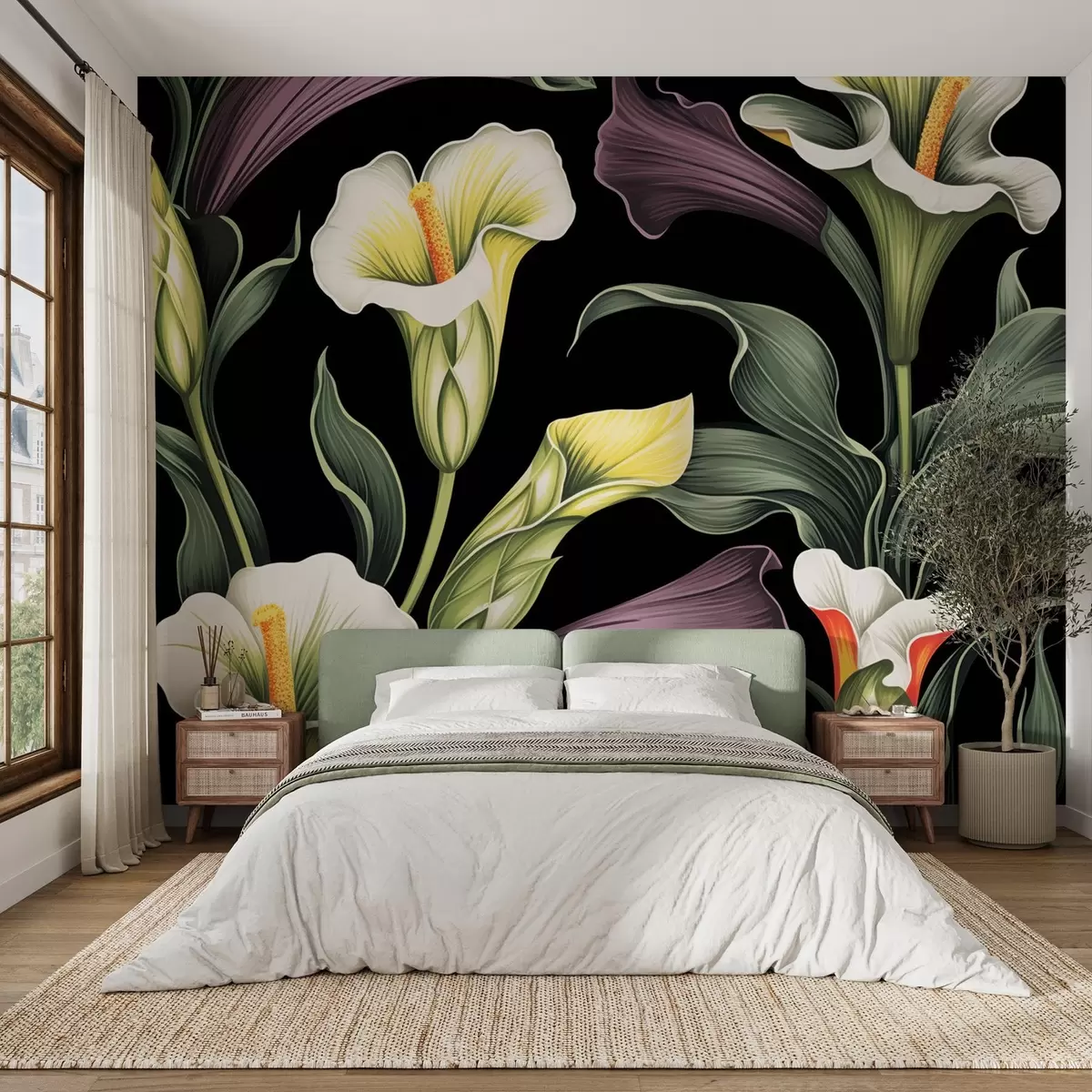 Τοιχογραφίες Λευκοπράσινες και μοβ κάλλες σε μαύρο φόντο Nr. w08752