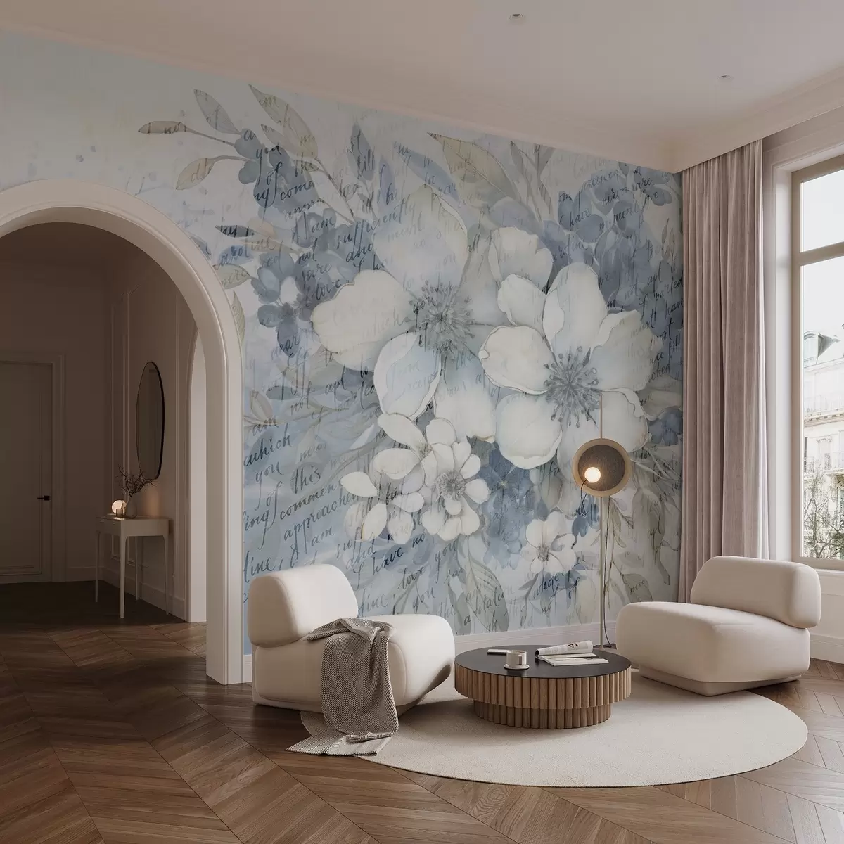 Τοιχογραφίες Μια μαλακή απομίμηση τοίχου με υφή λευκών και μπλε λουλουδιών, σε ανοιχτόχρωμο φόντο με αχνό χειρόγραφο κείμενο Nr. w08771