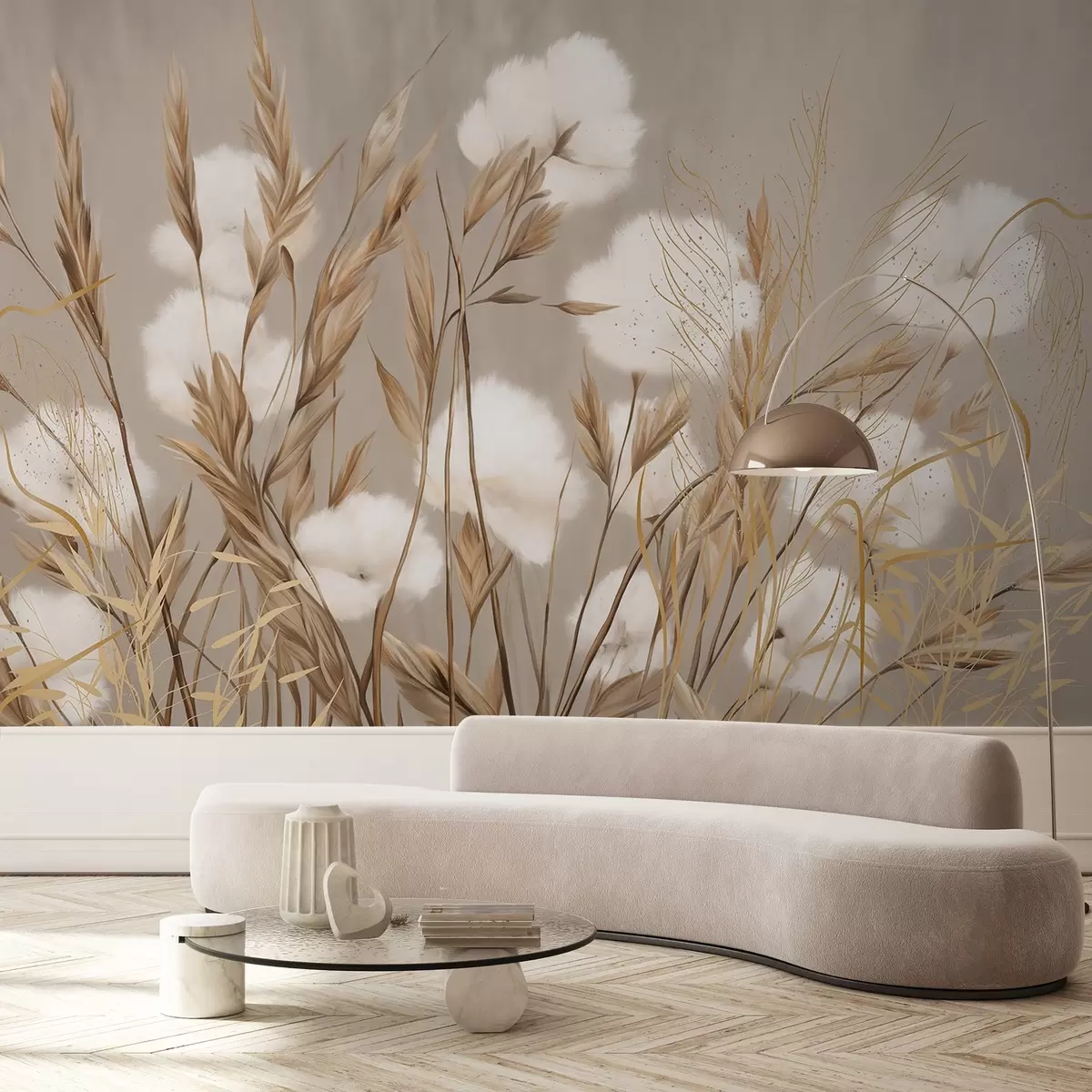 Τοιχογραφίες Μαλακά, χνουδωτά βαμβακερά λευκά λουλούδια και ψηλά πορτοκαλί χόρτα σε μπεζ φόντο με απαλή υφή Nr. w08784