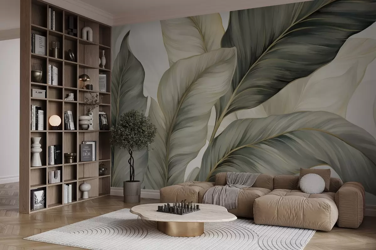 Τοιχογραφίες Μεγάλα, στυλιζαρισμένα φύλλα με λεπτομερείς φλέβες σε διάφορες αποχρώσεις του πράσινου, του κρεμ και του μπεζ Nr. w08785