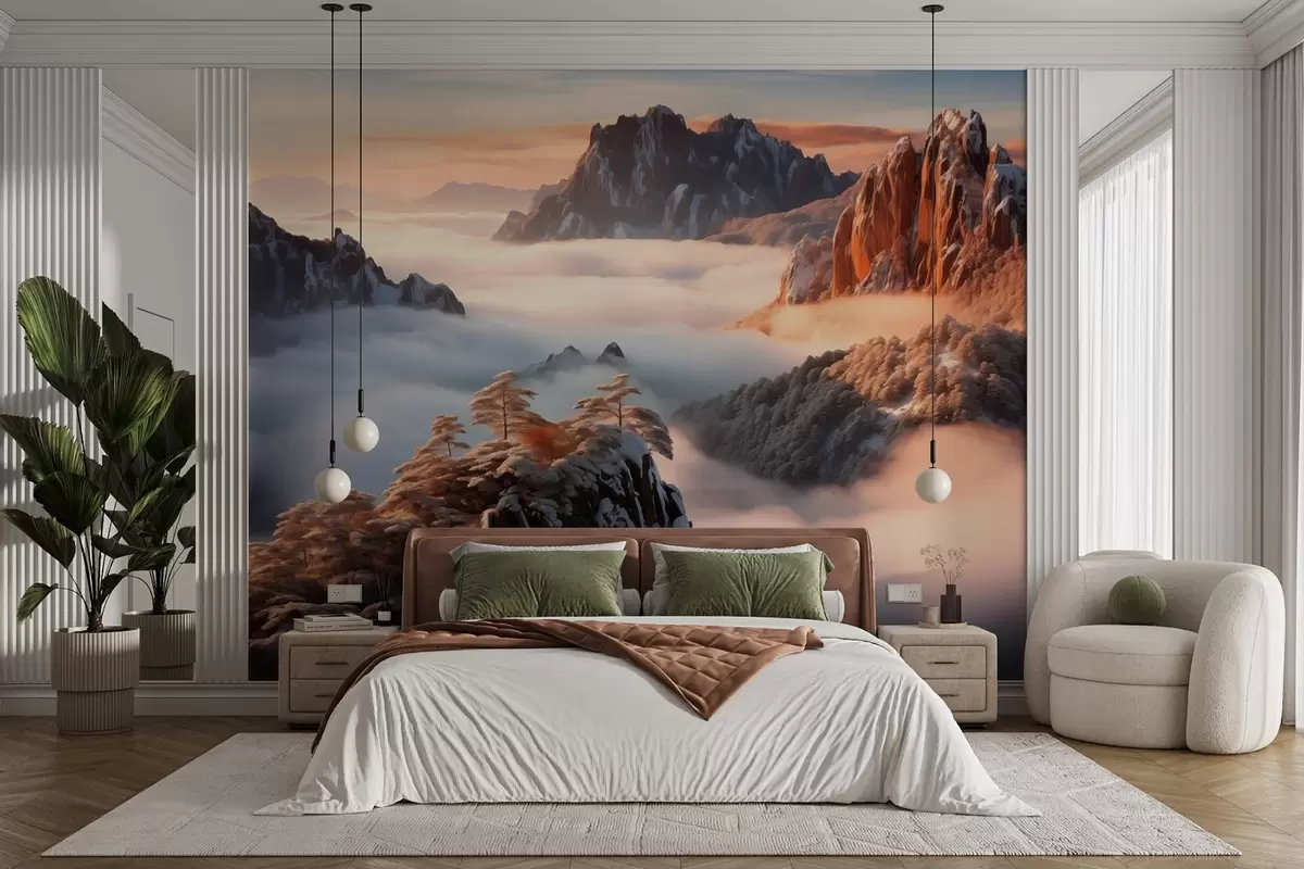 Τοιχογραφίες Γοητευτικό ορεινό τοπίο με ομίχλη και δέντρα Nr. w08807