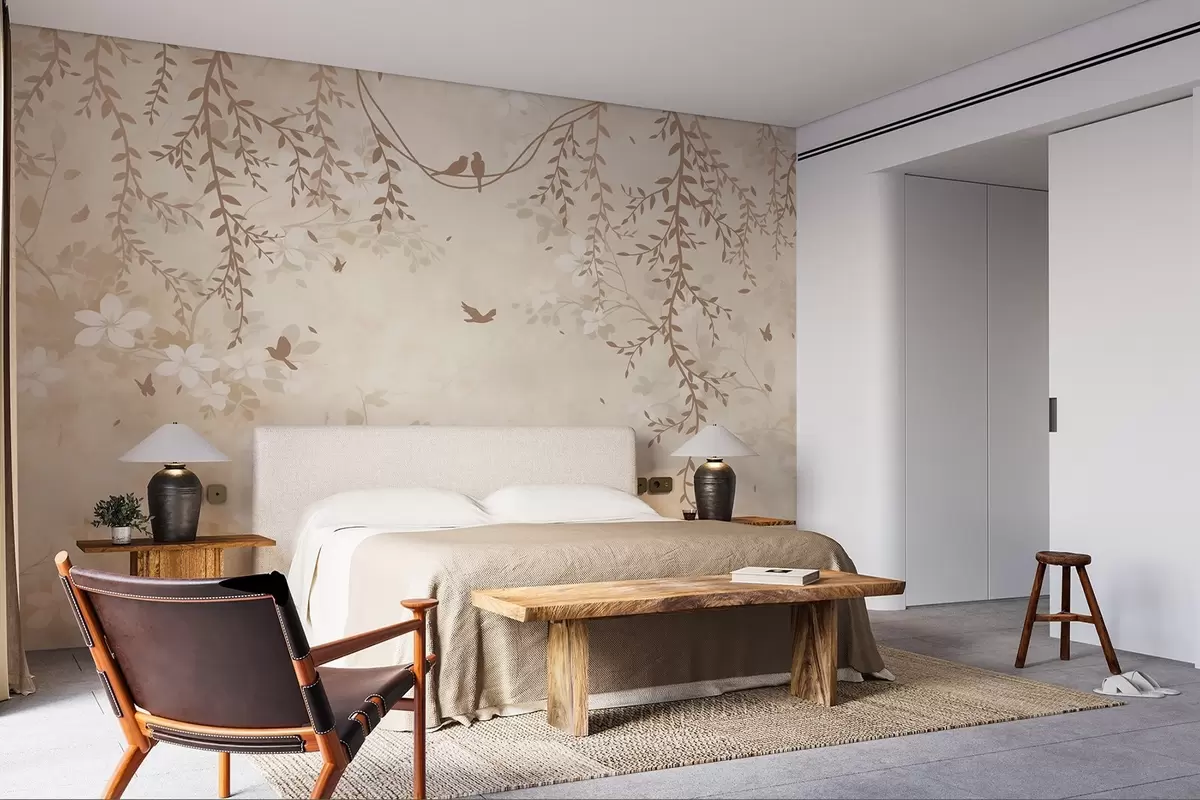 Τοιχογραφίες Πουλιά με κρεμαστά φυτά και φλοράλ μοτίβο σε ανοιχτές μπεζ-κρεμ αποχρώσεις Nr. w08809