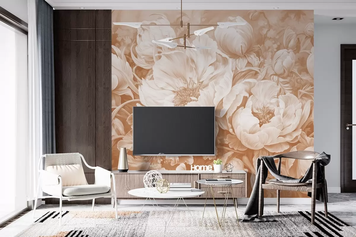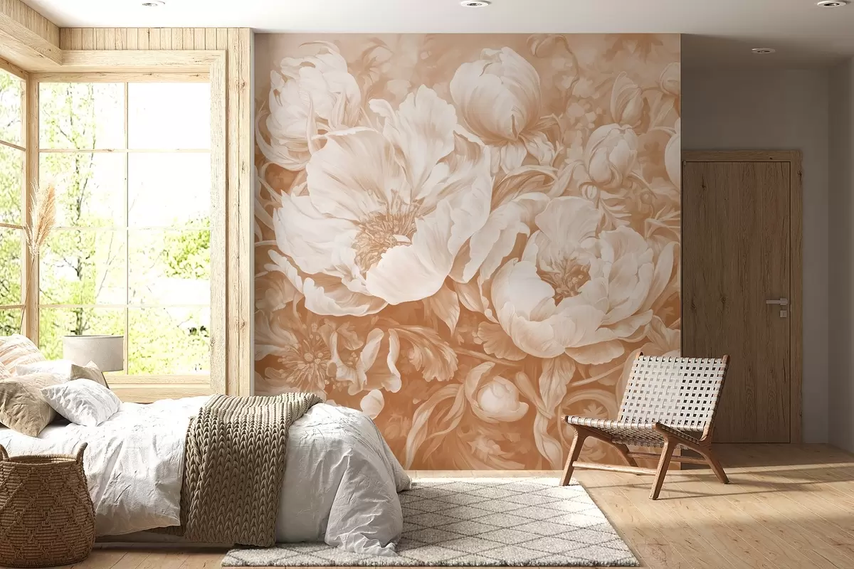 Τοιχογραφίες Τουλίπες και παιώνιες, μια λουλουδάτη σύνθεση σε μπεζ στυλ με πινελιές πετρελαίου Nr. w08817v1