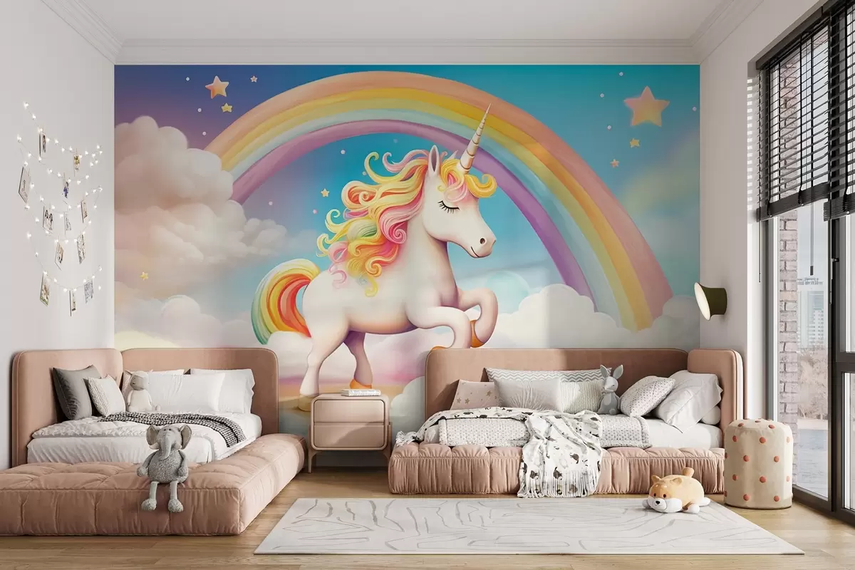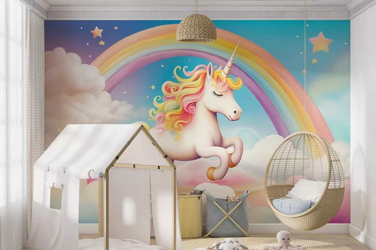 Τοιχογραφίες Ένα άλογο μονόκερος με ουράνιο τόξο, σύννεφα και ένα έναστρο ουρανό Nr. w08820