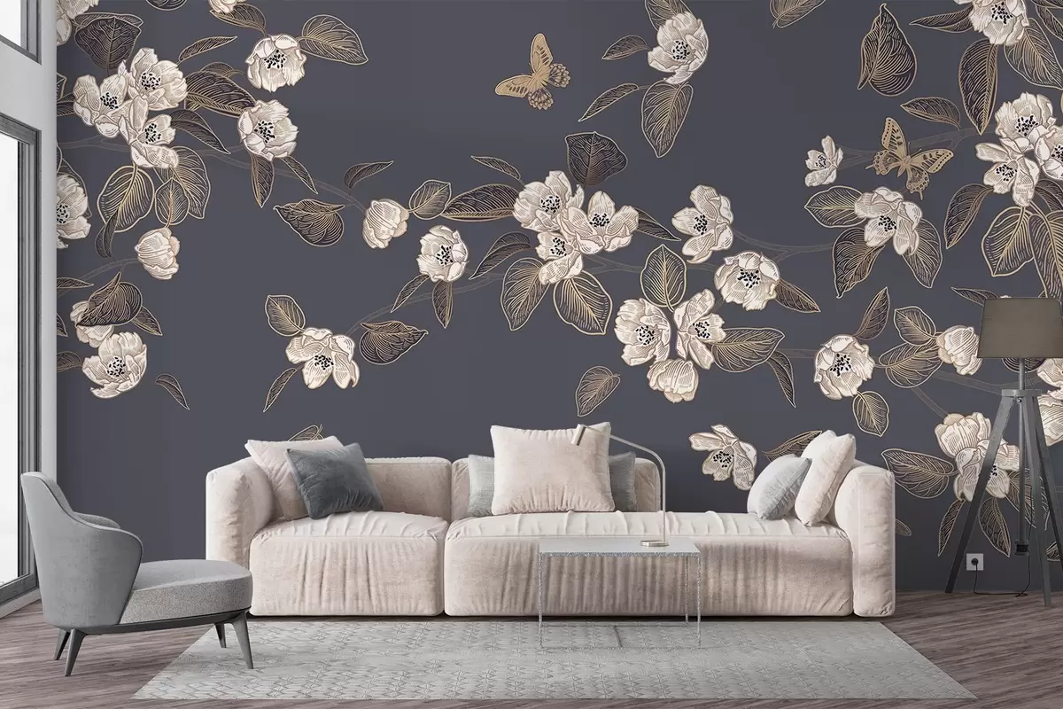 Τοιχογραφίες Κλάδος από άνθη κερασιάς με λουλούδια, φύλλα, πεταλούδες σε σκούρο γκρι φόντο Nr. w08830