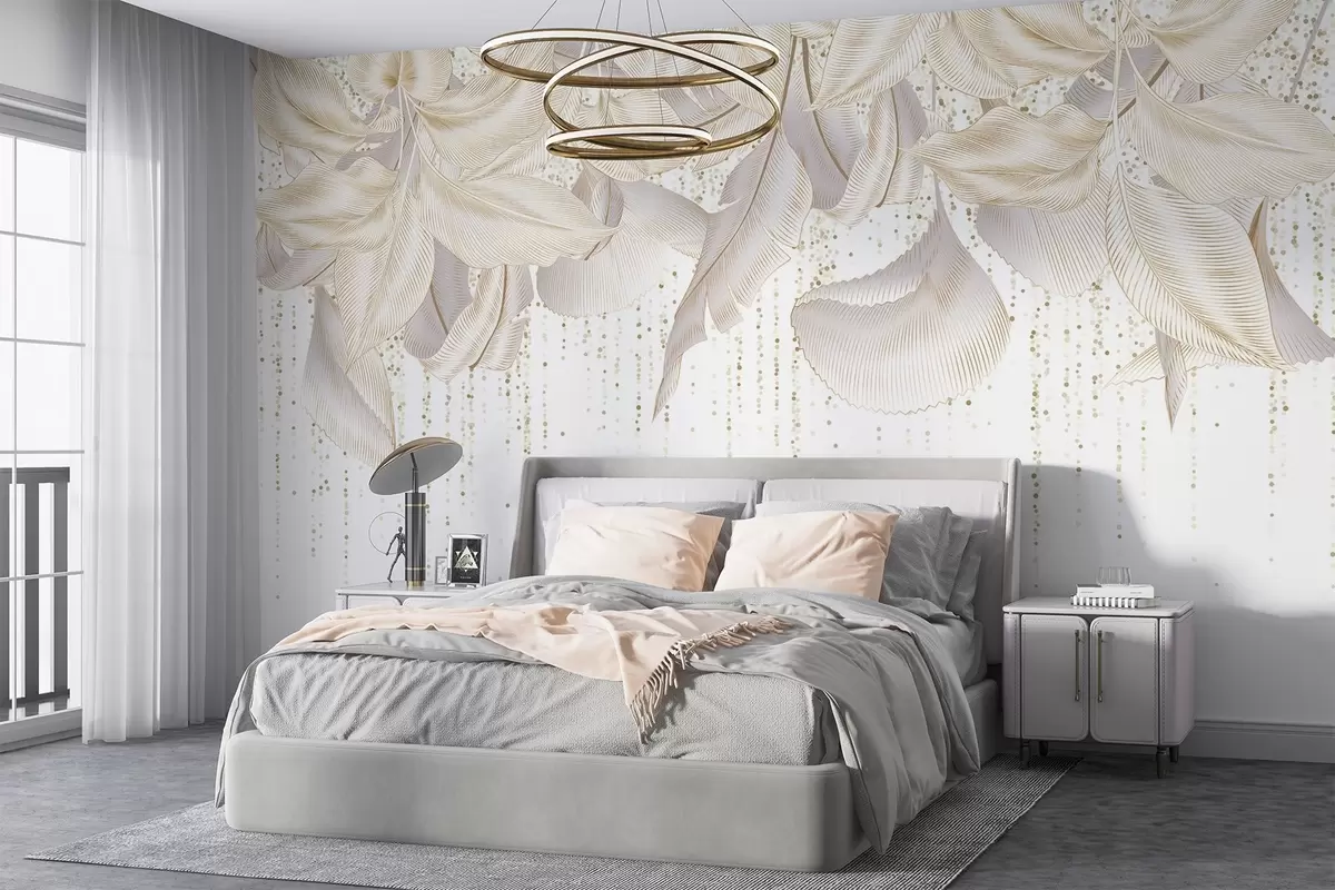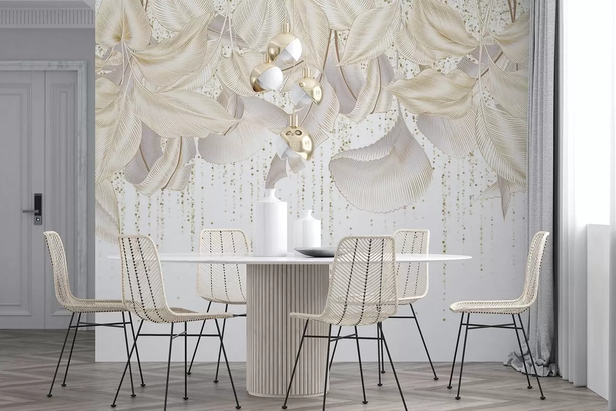 Τοιχογραφίες Λευκά λεπτομερή τροπικά φύλλα και κίτρινες τελείες υφή σε λευκό φόντο Nr. w08836
