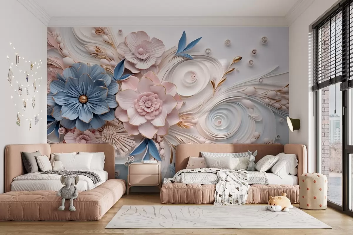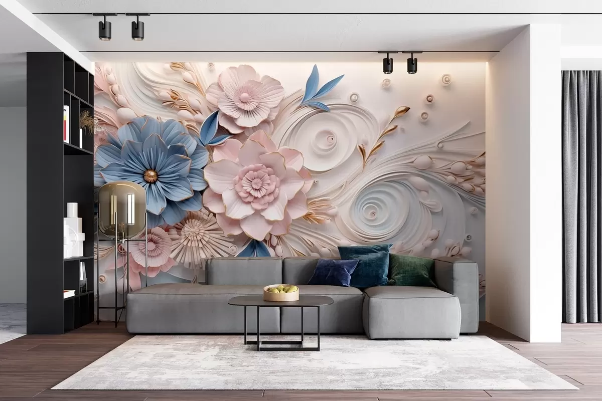 Τοιχογραφίες Μια ντελικάτη σύνθεση λουλουδιών σε ροζ και μπλε αποχρώσεις με απαλό ανάγλυφο φόντο Nr. w08847