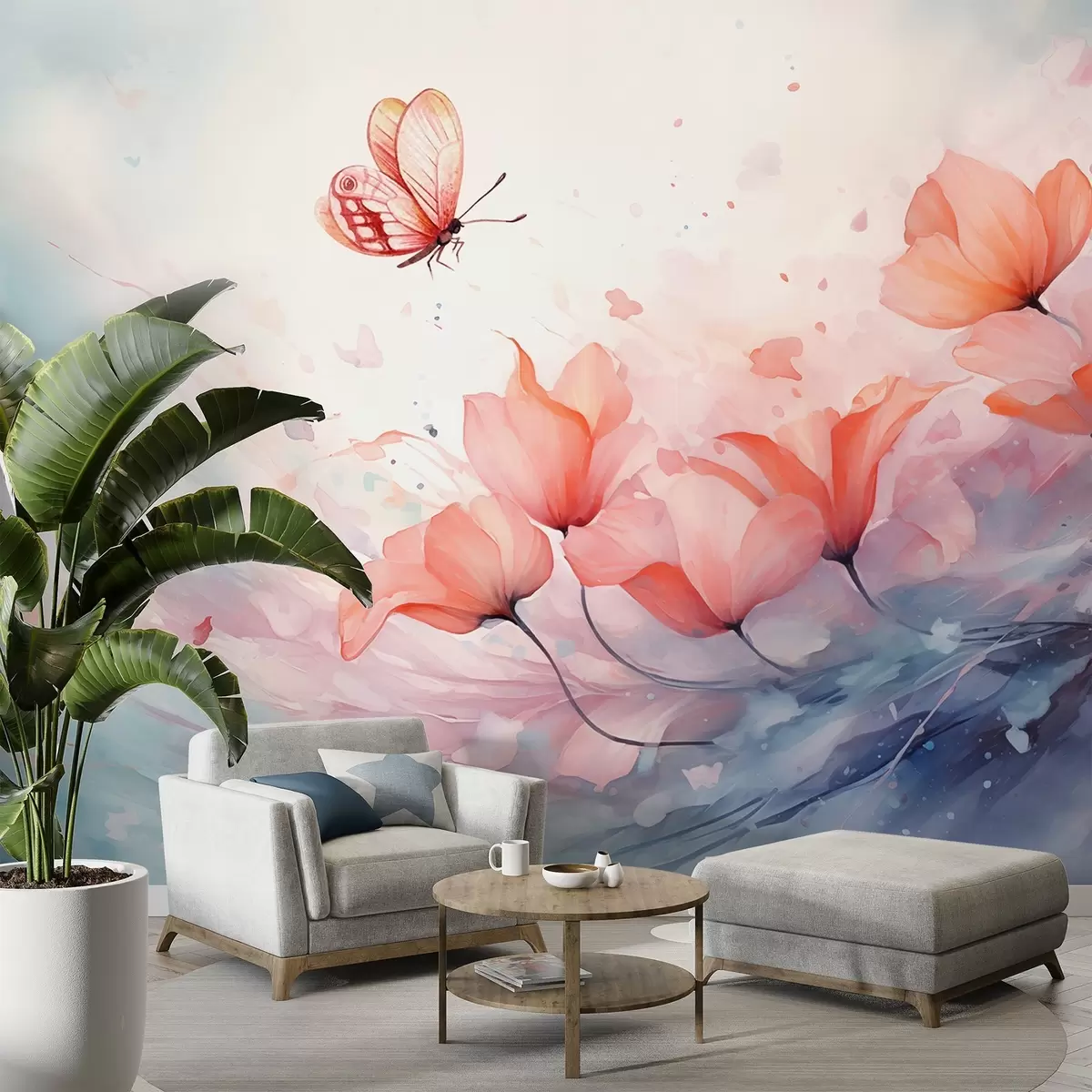 Τοιχογραφίες Ντελικάτες παπαρούνες με μια πεταλούδα σε στυλ ακουαρέλας Nr. w08849
