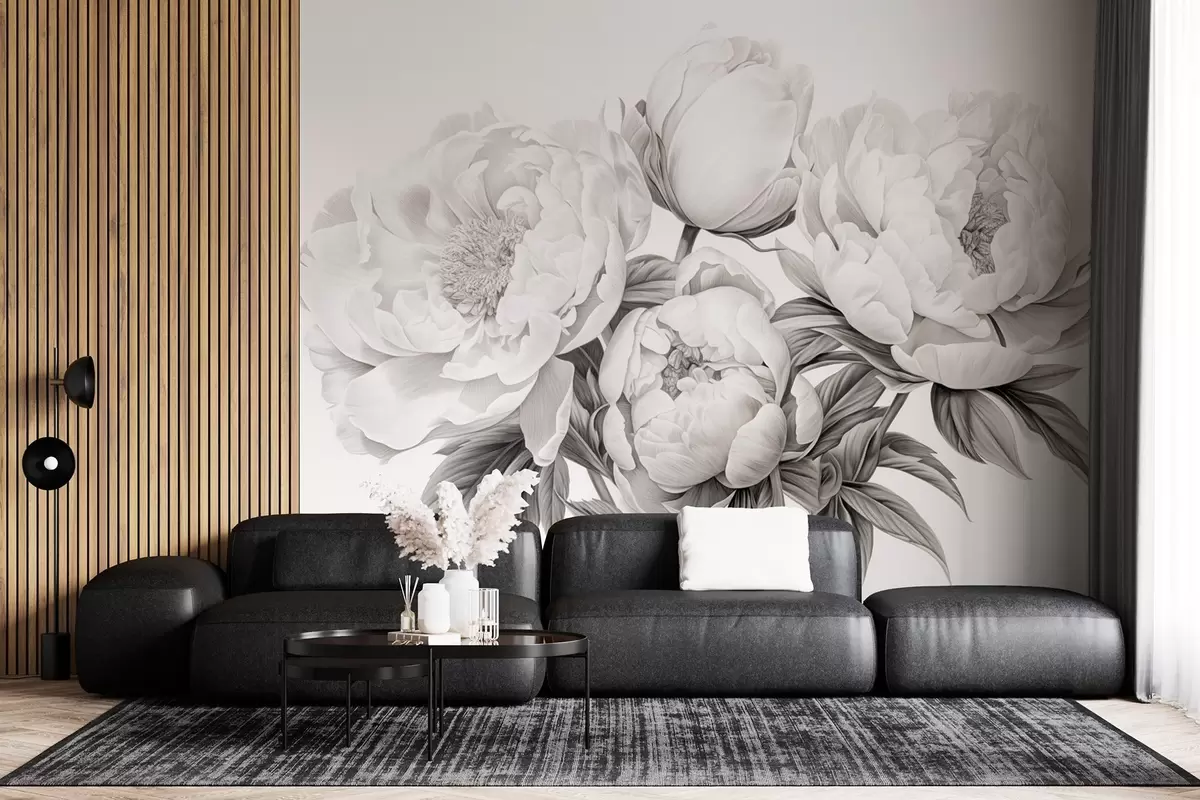 Τοιχογραφίες Μαύρες και λευκές παιώνιες σε στυλ σχεδίου με μολύβι Nr. w08852