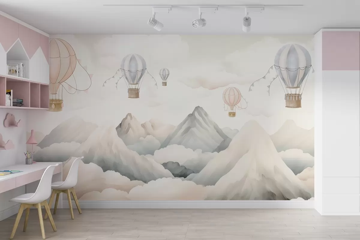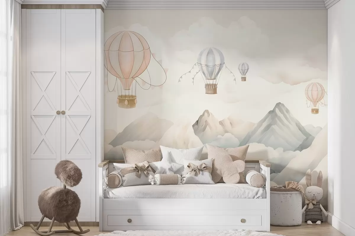 Τοιχογραφίες Αερόστατα θερμού αέρα που αιωρούνται πάνω από βουνά σε ουδέτερους, απαλούς παστέλ τόνους Nr. w08853