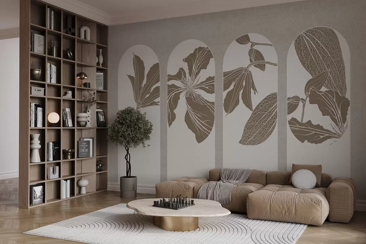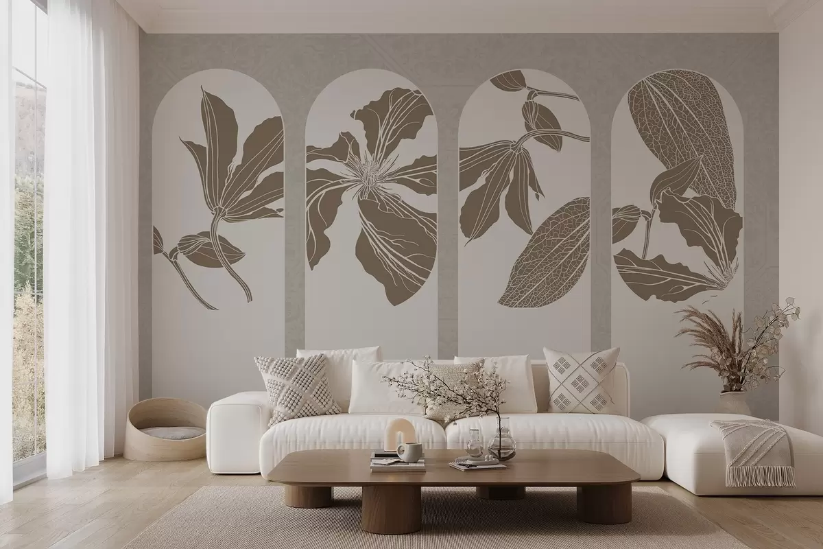 Τοιχογραφίες Κομψές καμάρες με λουλουδάτα σχέδια σε μπεζ και λευκό, σε μπεζ φόντο με υφή, μινιμαλιστικό στυλ Nr. w08866