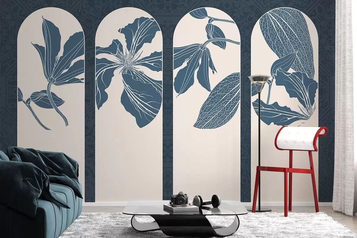Τοιχογραφίες Κομψές καμάρες με φλοράλ σχέδια σε σκούρο μπλε και λευκό, σε μπεζ φόντο, μινιμαλιστικό στυλ Nr. w08866v1