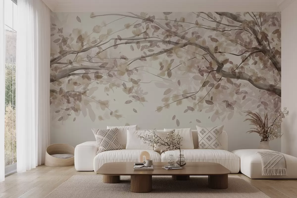 Τοιχογραφίες Κλαδιά από άνθη με μπεζ φύλλα, απαλά χρώματα, λεπτές λεπτομέρειες, στυλ ακουαρέλας, σε ανοιχτό φόντο Nr. w08867v1