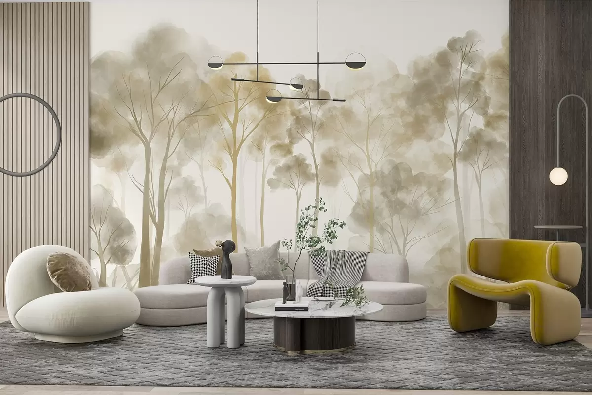 Τοιχογραφίες Δάσος σε στυλ ακουαρέλας με ψηλά ανοιχτόχρωμα δέντρα σε αποχρώσεις του μπεζ και του κίτρινου, με ομιχλώδη ατμόσφαιρα Nr. w08870