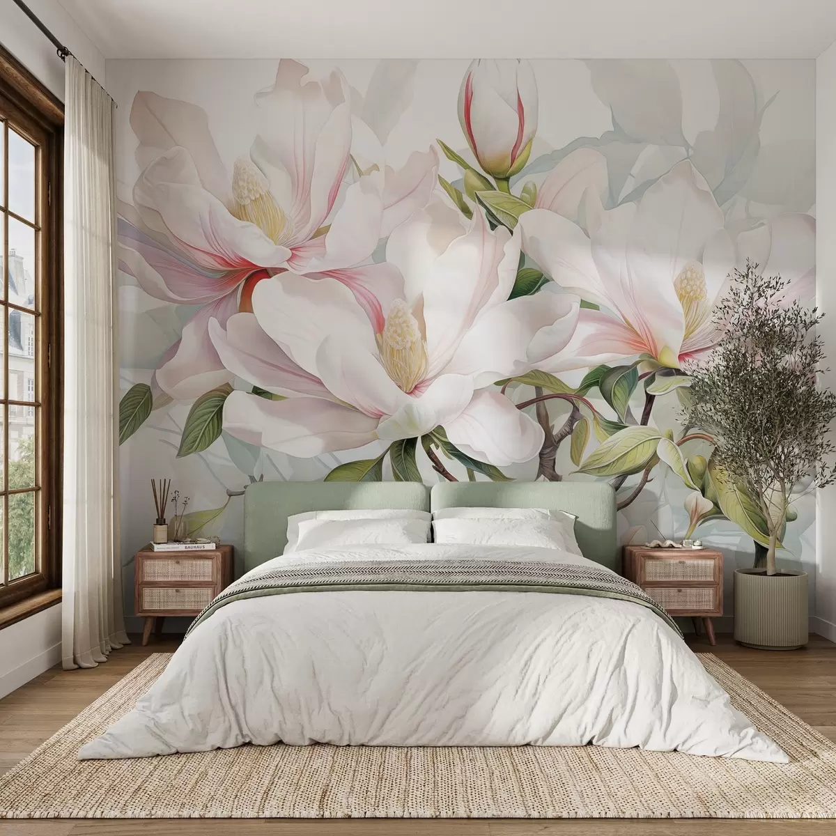 Τοιχογραφίες Λουλούδια μανόλιας με λευκά και ροζ πέταλα, φύλλα και καφέ κλαδιά, απαλό και ντελικάτο στυλ ακουαρέλας Nr. w08885