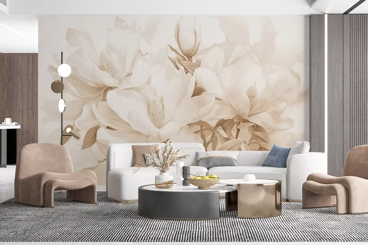 Τοιχογραφίες Λουλούδια μανόλιας με λευκά και μπεζ πέταλα, φύλλα και καφέ κλαδιά, απαλό και ντελικάτο στυλ ακουαρέλας Nr. w08886