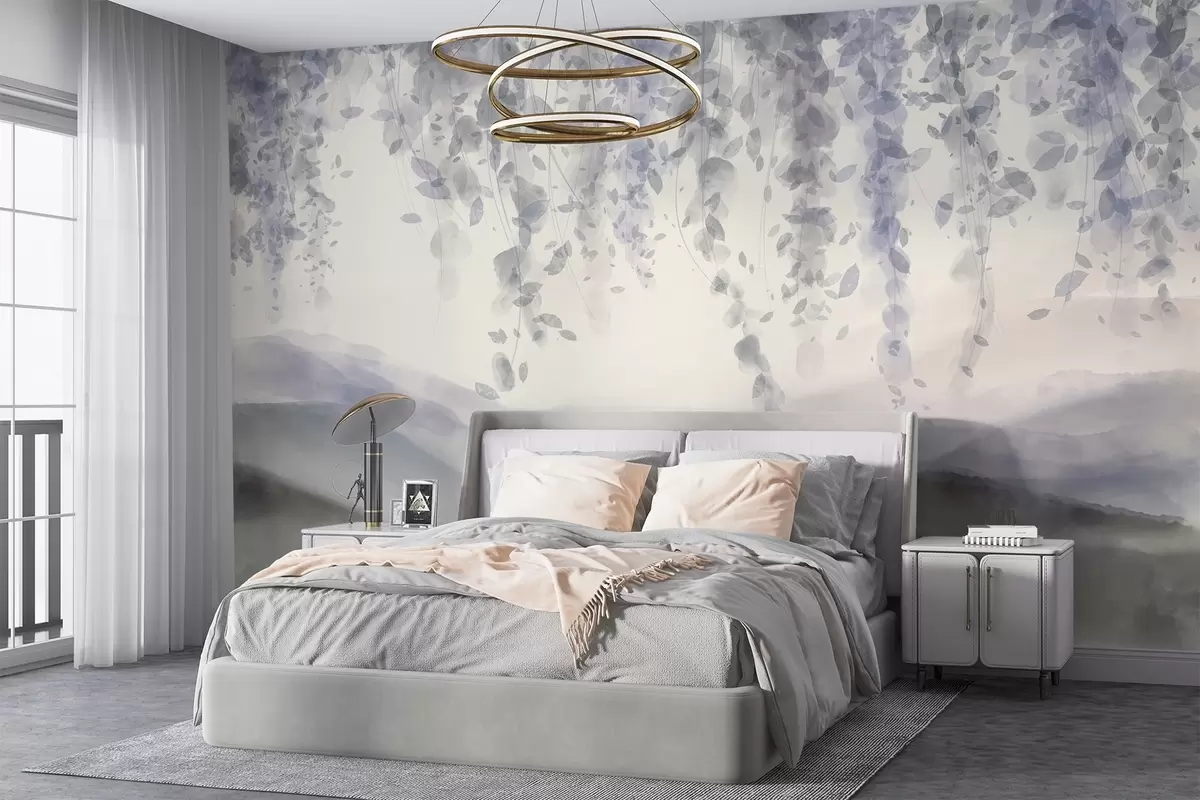 Τοιχογραφίες Γλιστρίδα φύλλα κρέμονται πάνω από μπλε βουνά, μαλακό παστέλ μπλε και γκρι χρώματα, ακουαρέλα στυλ τοπίο Nr. w08909