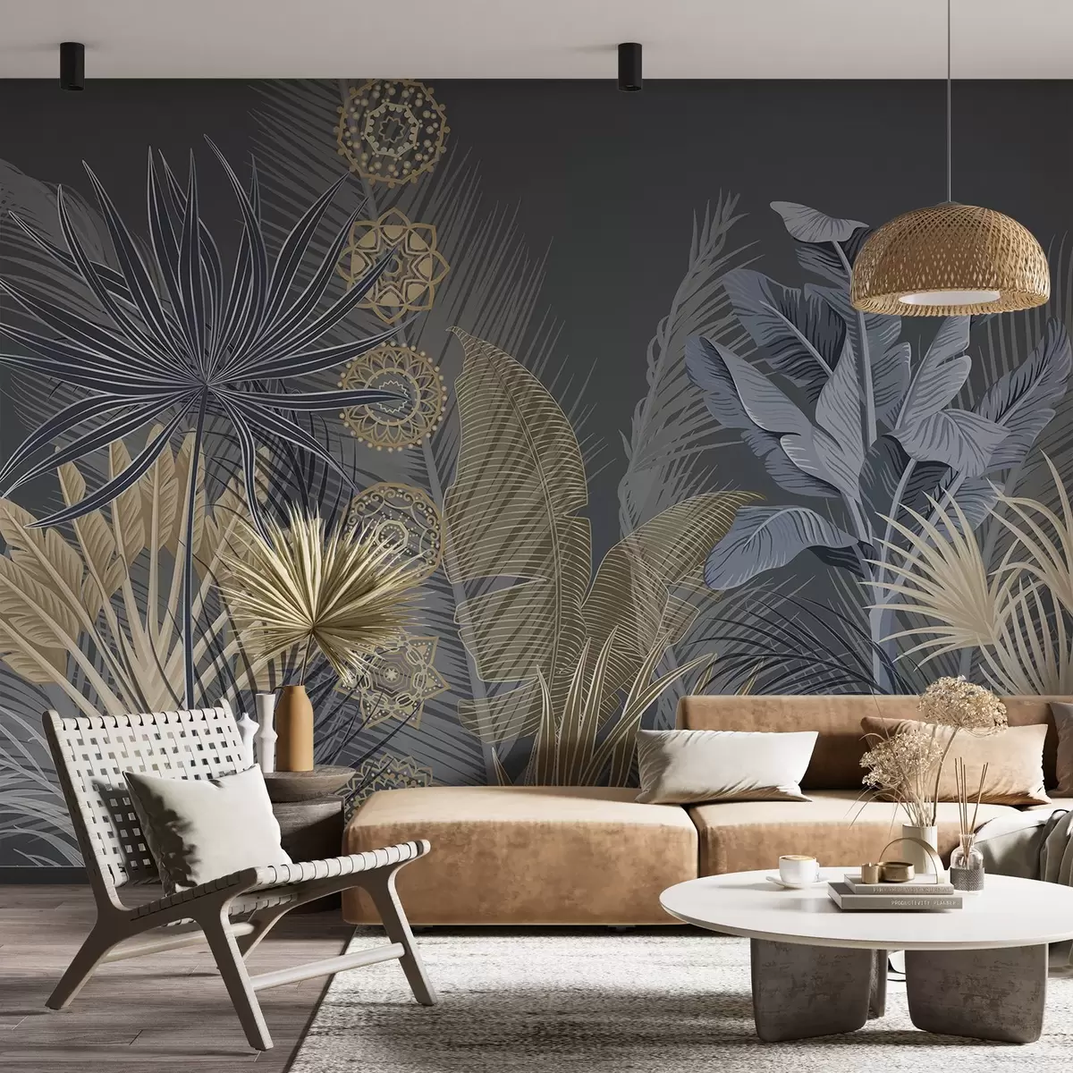 Τοιχογραφίες Τροπικά φύλλα σε μπλε και καφέ αποχρώσεις, φύλλα φοίνικα, φύλλα μπανάνας και στολίδια μαντάλα, σκούρο φόντο Nr. w08913