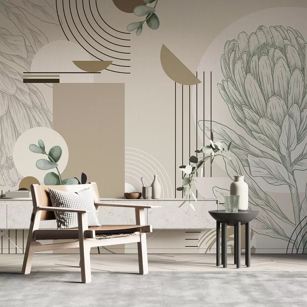Τοιχογραφίες Αφηρημένη βοτανική εκτύπωση με λουλούδι πρωτέας, φύλλα ευκαλύπτου, γεωμετρικά σχήματα σε μινιμαλιστικό στυλ, παστέλ χρώματα Nr. w08914
