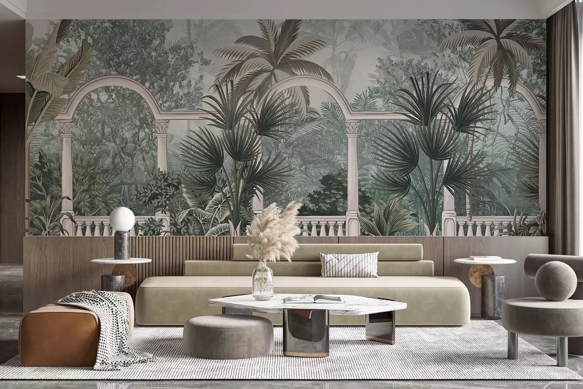 Τοιχογραφίες Τροπικός κήπος με φοίνικες και πλούσια βλάστηση, κιγκλίδωμα με καμάρες, απαλά χρώματα, vintage στυλ Nr. w08916