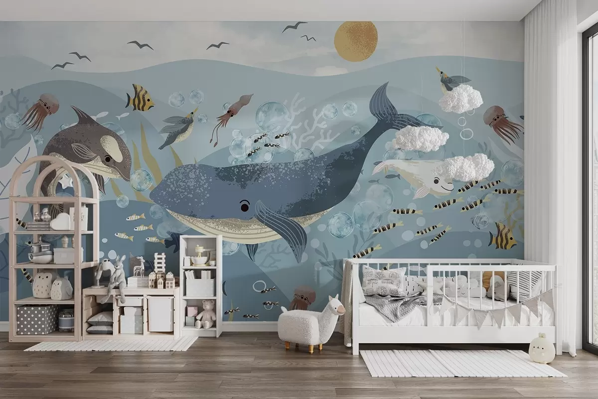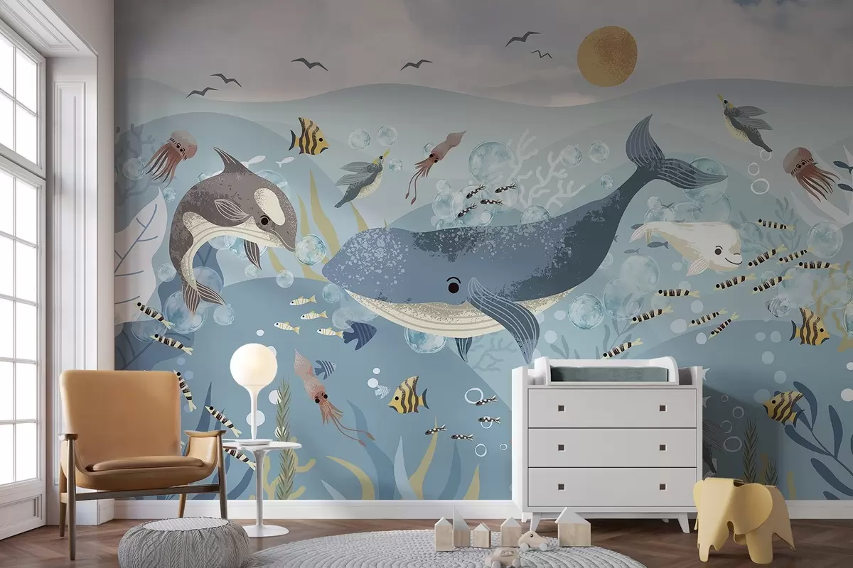 Τοιχογραφίες Παιδική εικονογράφηση χαριτωμένη εκτύπωση με μπλε φάλαινα που περιβάλλεται από ψάρια, καλαμάρια, μέδουσες σε έναν μπλε ωκεανό με φυσαλίδες Nr. w08921