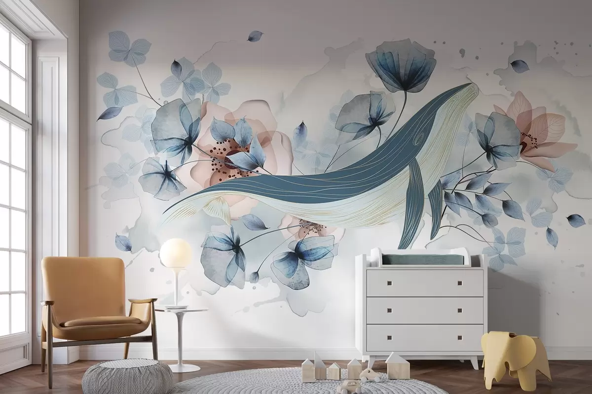 Τοιχογραφίες Μια μπλε φάλαινα με λουλούδια, στυλ ακουαρέλας, γαλάζια και ροζ χρώματα, ελαφρύ φόντο Nr. w08922