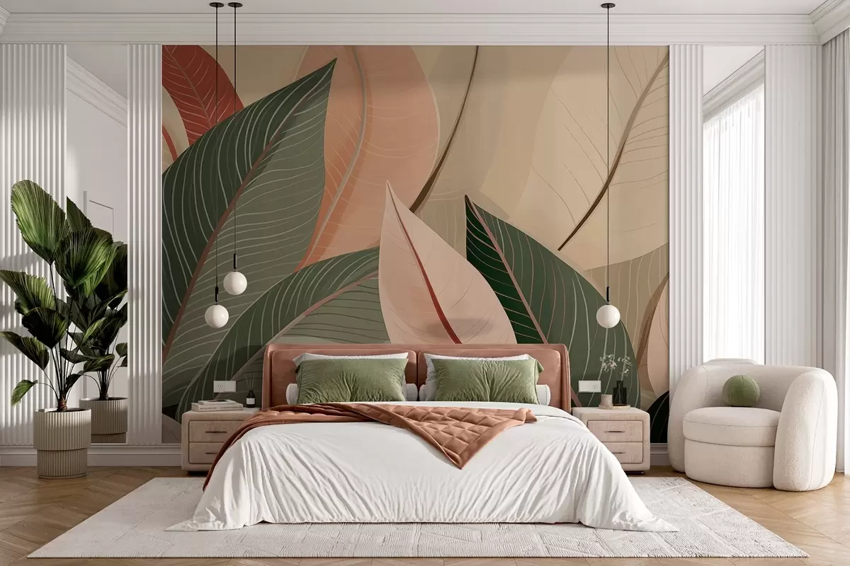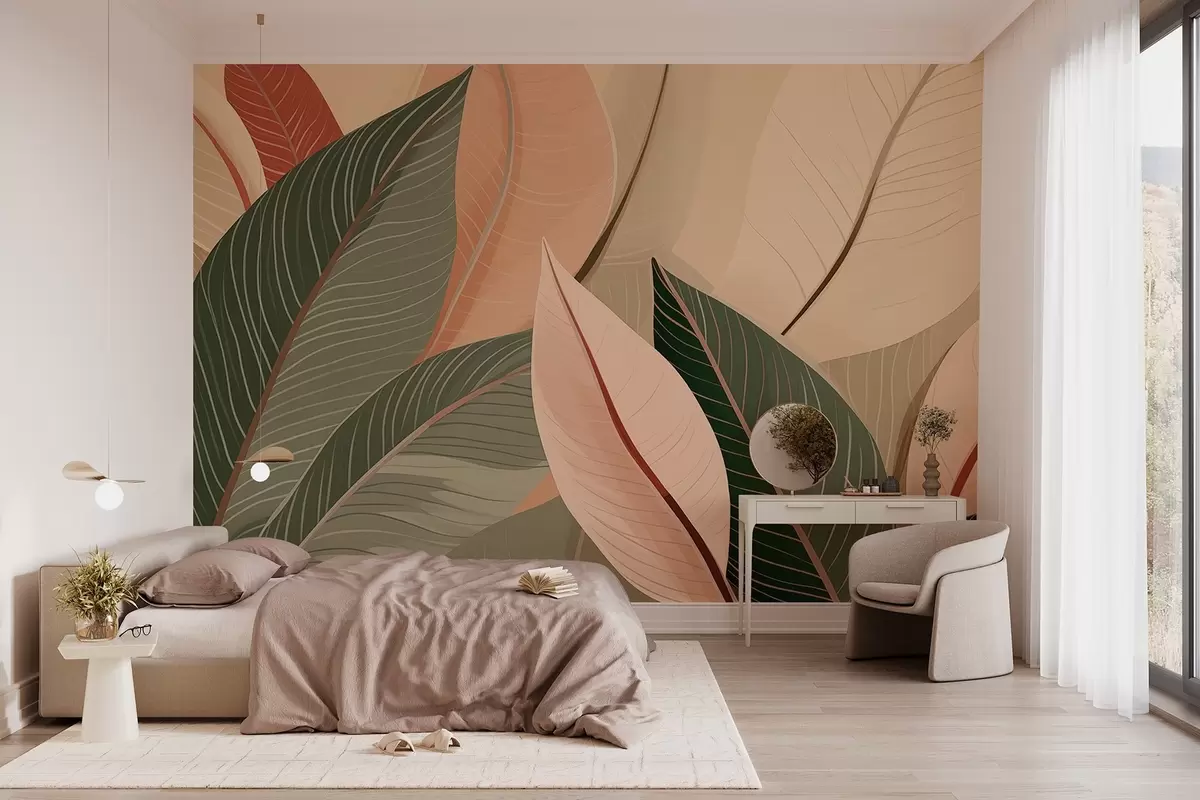 Τοιχογραφίες Κοντινό πλάνο φύλλων σε λαδί και ροζ-κρεμ χρώματα Nr. w08944