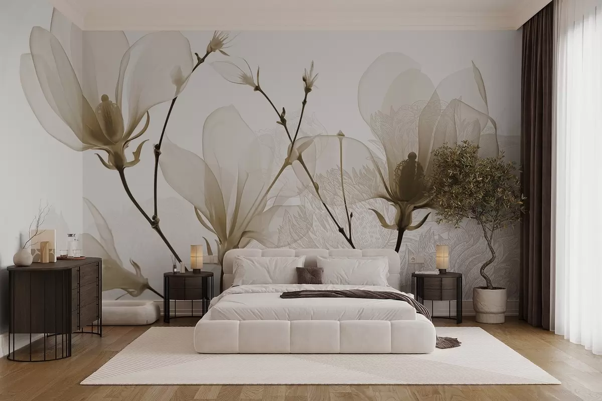 Τοιχογραφίες Διάφανα μπεζ λουλούδια μανόλιας με σιλουέτες λουλουδιών με λεπτεπίλεπτα πέταλα και σκούρα στελέχη Nr. w08978v1