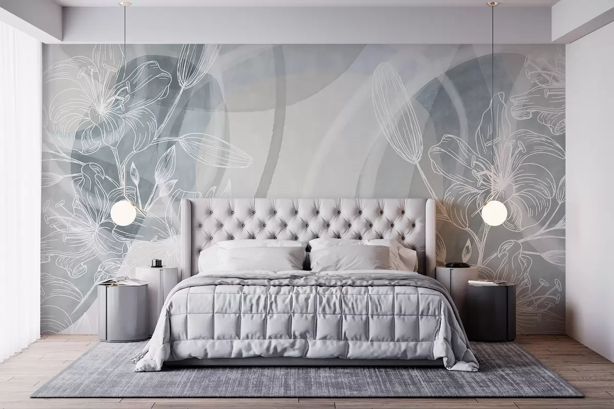 Τοιχογραφίες Μινιμαλιστικό σχέδιο λουλουδιών με λευκά λουλούδια και φύλλα, επικαλυπτόμενους αφηρημένους κύκλους σε αποχρώσεις του γκρι και του μπλε Nr. w08979