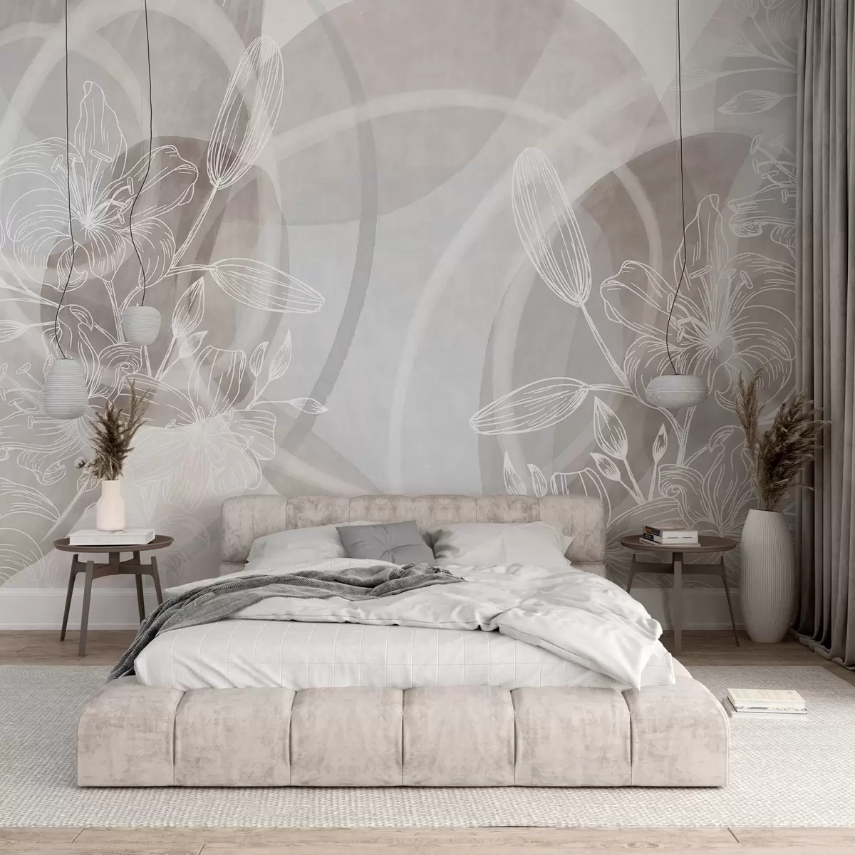Τοιχογραφίες Μινιμαλιστικό σχέδιο λουλουδιών με λευκά λουλούδια και φύλλα, επικαλυπτόμενους αφηρημένους κύκλους σε αποχρώσεις του μπεζ και του μπλε Nr. w08979v1