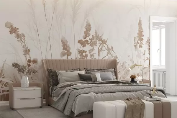 Τοιχογραφίες Καφέ λουλούδια και μπεζ καλαμιές σε ένα χωράφι, μινιμαλιστική υφή ζωγραφικής, ελαφρύ φόντο, απαλά χρώματα, λεπτές πινελιές Nr. w08982v1