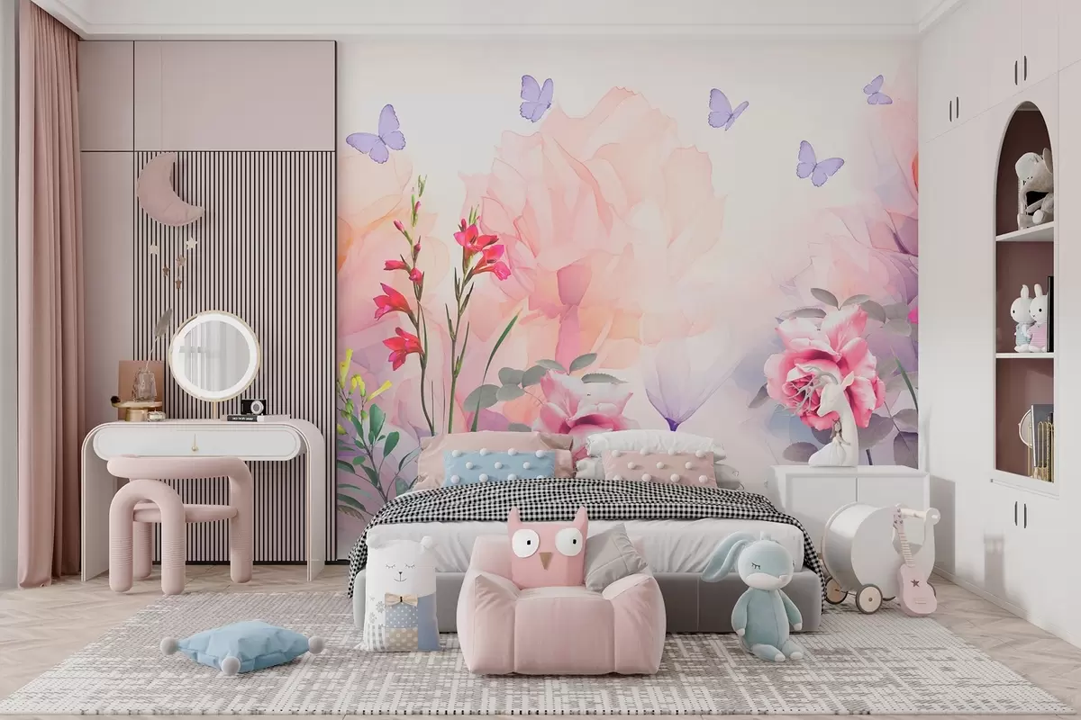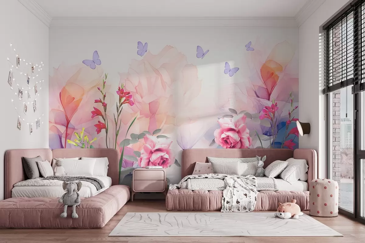 Τοιχογραφίες Λουλούδια με πεταλούδες και τριαντάφυλλα σε στυλ ακουαρέλας Nr. w09002