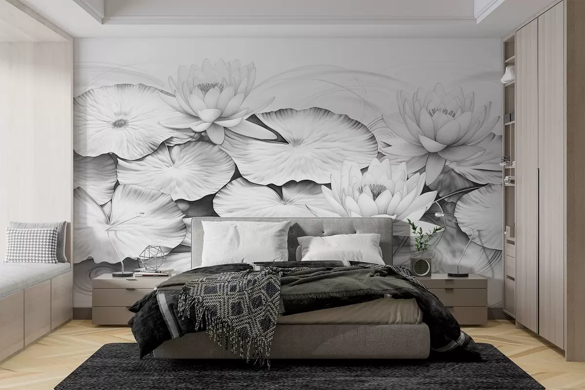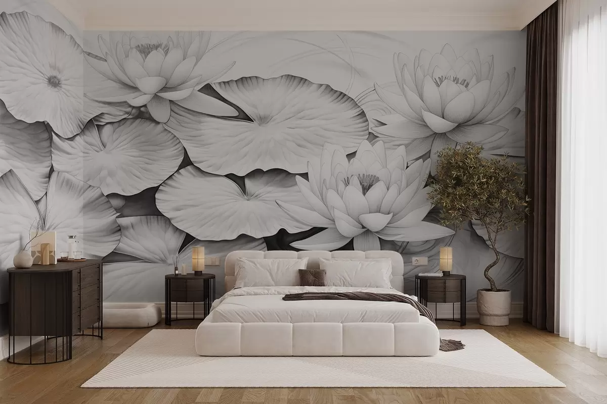 Τοιχογραφίες Κρίνοι και κρινάκια σε μια λίμνη, ασπρόμαυρη απομίμηση σχεδίου με μολύβι, λεπτομερής βοτανική απεικόνιση, τέχνη της φύσης Nr. w09006