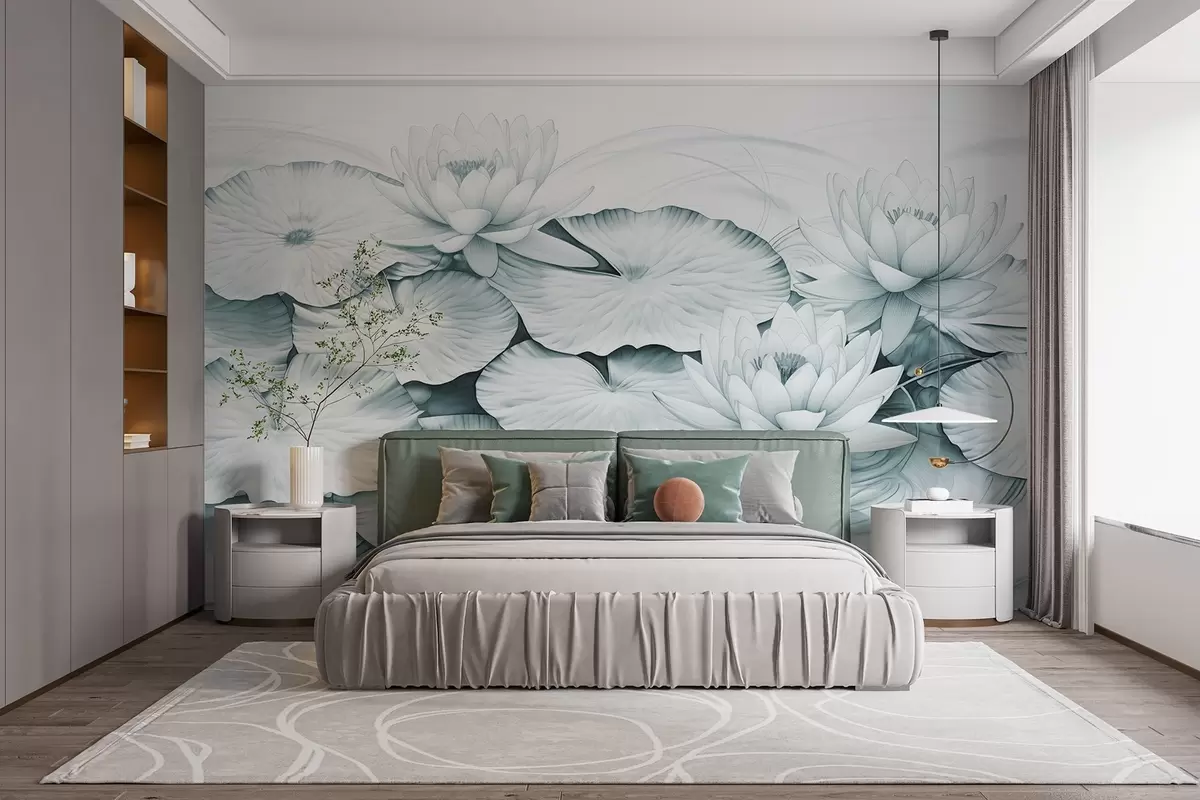 Τοιχογραφίες Κρίνοι και κρινάκια σε μια λίμνη, τυρκουάζ και λευκή απομίμηση του σχεδίου με μολύβι, λεπτομερής βοτανική εικονογράφηση, τέχνη της φύσης Nr. w09006v1