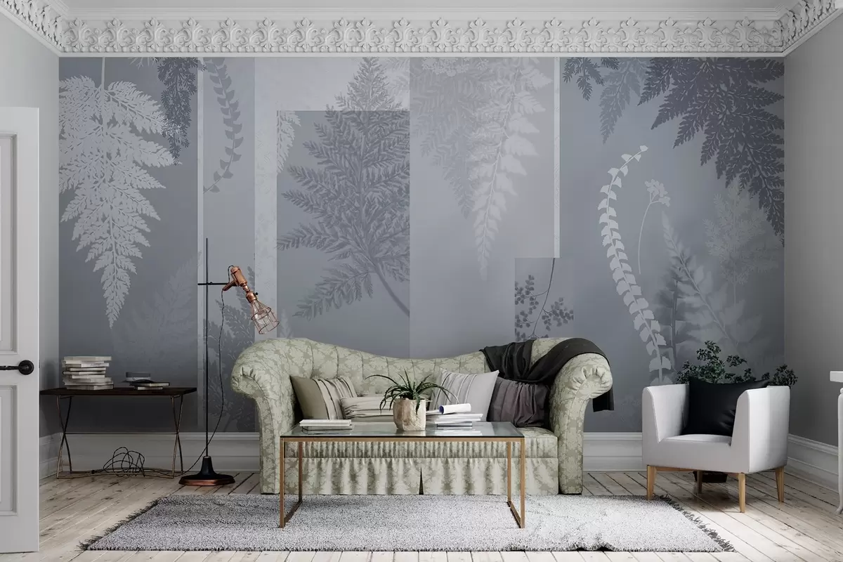 Τοιχογραφίες Φύλλα φτέρης σε μπλε και λευκό χρώμα, τοποθετημένα σε κάθετες λωρίδες, δημιουργώντας ένα βοτανικό και μινιμαλιστικό σχέδιο, σε απαλά και σιωπηλά χρώματα Nr. w09007v1
