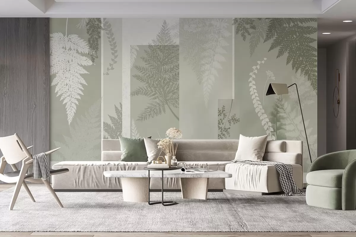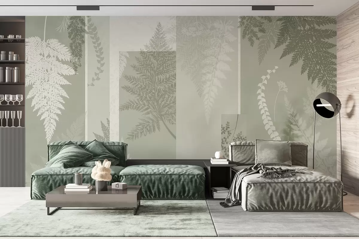 Τοιχογραφίες Φύλλα φτέρης σε πράσινο και λευκό χρώμα, τοποθετημένα σε κάθετες λωρίδες, δημιουργώντας ένα βοτανικό και μινιμαλιστικό σχέδιο, σε απαλά και σιωπηλά χρώματα Nr. w09007v2