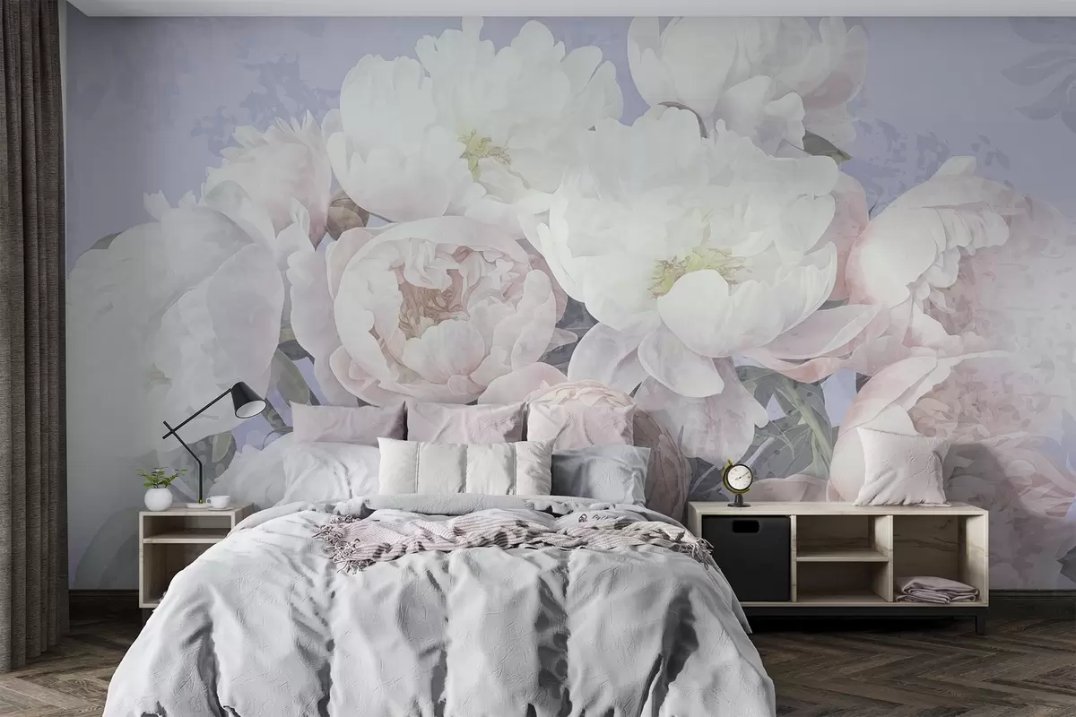 Τοιχογραφίες Υφή αφηρημένη ροδακινί και λευκές παιώνιες με πράσινα φύλλα, ελαφρύ φόντο, απαλά και ευαίσθητα χρώματα, vintage στυλ Nr. w09008v1