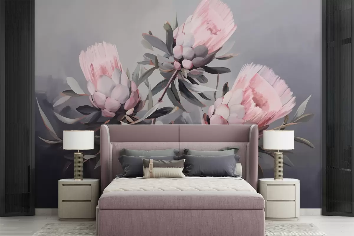 Τοιχογραφίες Ροζ πρωτέα αφηρημένα λουλούδια με γκρι φύλλα, απαλές πινελιές με απαλή υφή, απαλά χρώματα, σε θολό γκρι φόντο Nr. w09014