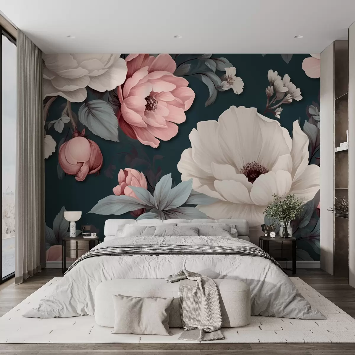 Τοιχογραφίες Λευκές και ροζ παιώνιες σε σκούρο μπλε φόντο Nr. w09017