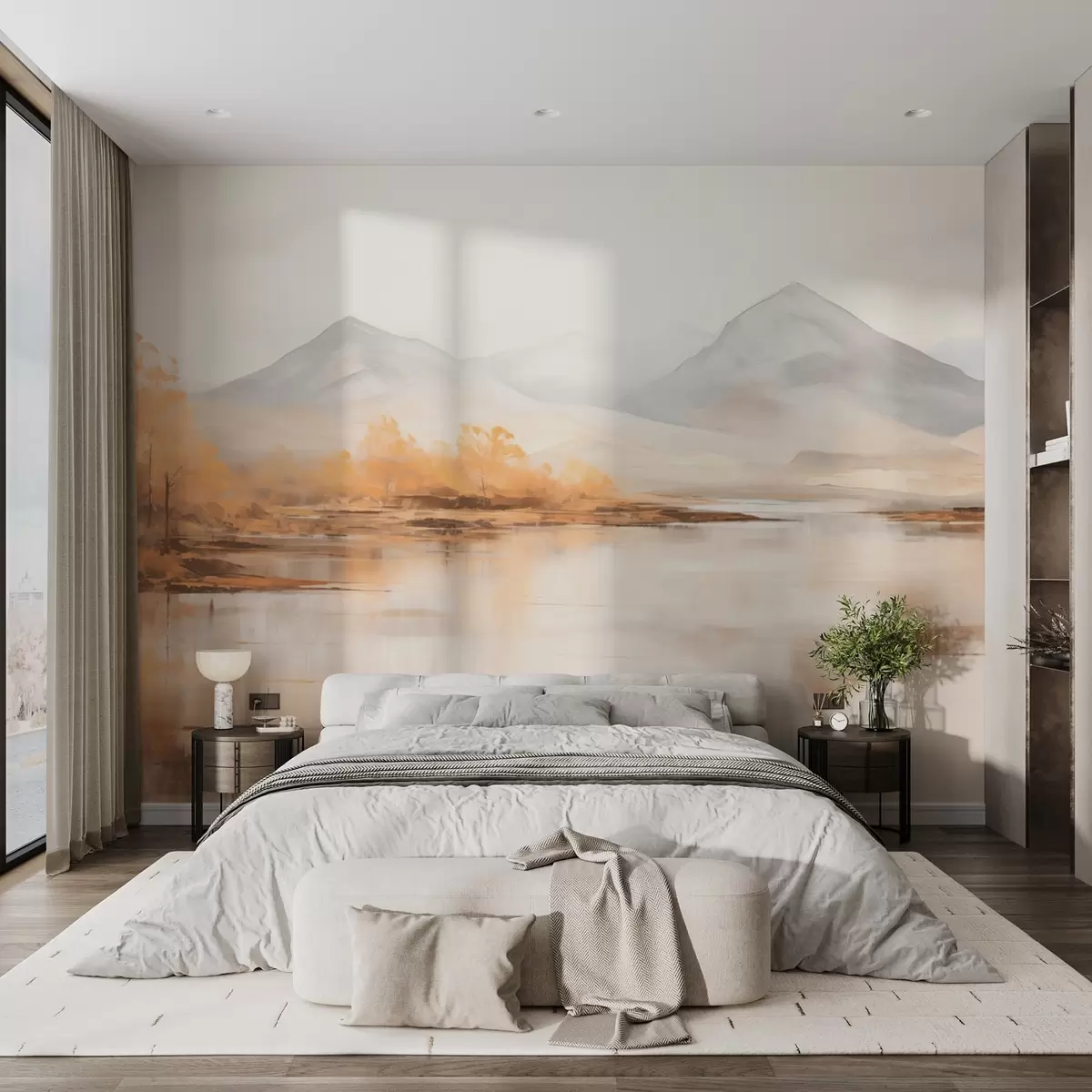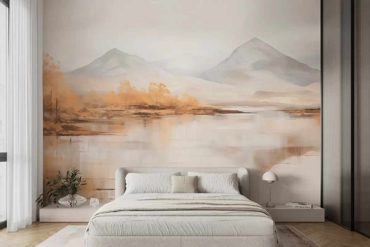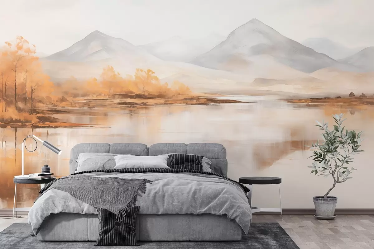 τοιχογραφίες Φθινοπωρινό τοπίο με κίτρινα δέντρα και ένα ποτάμι με φόντο ένα βουνό w09020